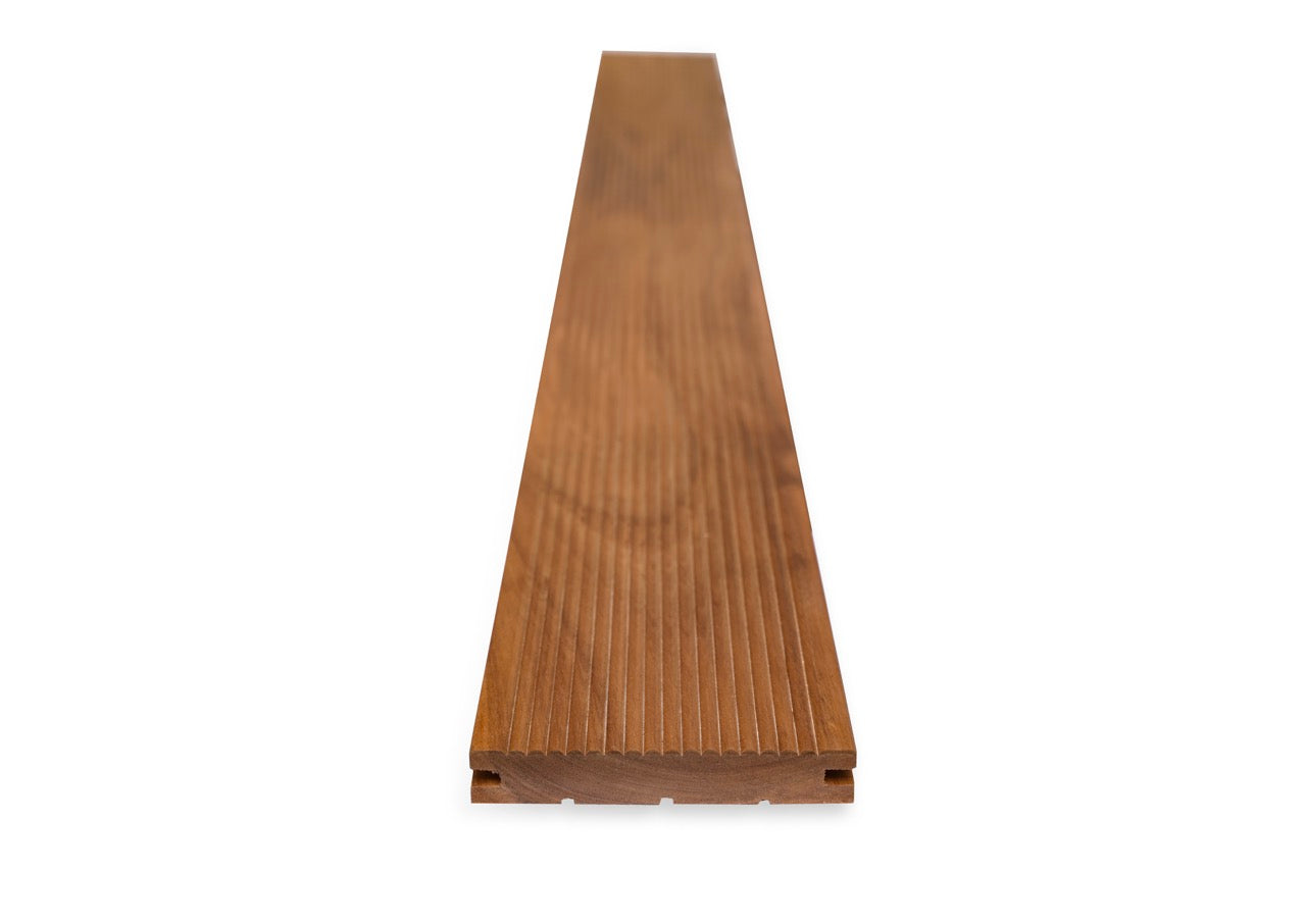 Dzięki głębokim, bogatym odcieniom i wyrafinowanej strukturze słojów, deski tarasowe z Termo-drewna Akacjowego są doskonałym wyborem na tarasy, patia i inne obszary narażone na wysoką wilgotność. Rowkowana powierzchnia z jednej strony poprawia przyczepność i ułatwia odprowadzanie wody, co czyni je praktycznym wyborem do zastosowań na zewnątrz.
